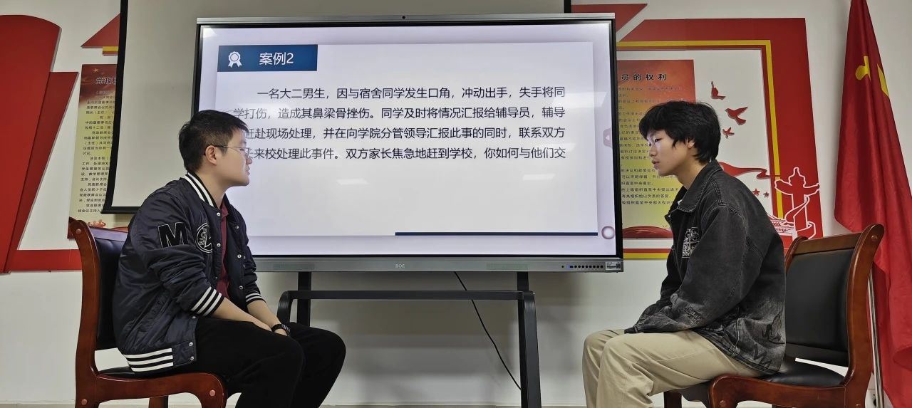 参赛辅导员随机抽取案例,两两一组,采取AB角的形式,以“你问我答”的形式展开PK,展现了熟练的理论知识和优秀的专业素养,更体现了他们对学生日常生活的深切关心。